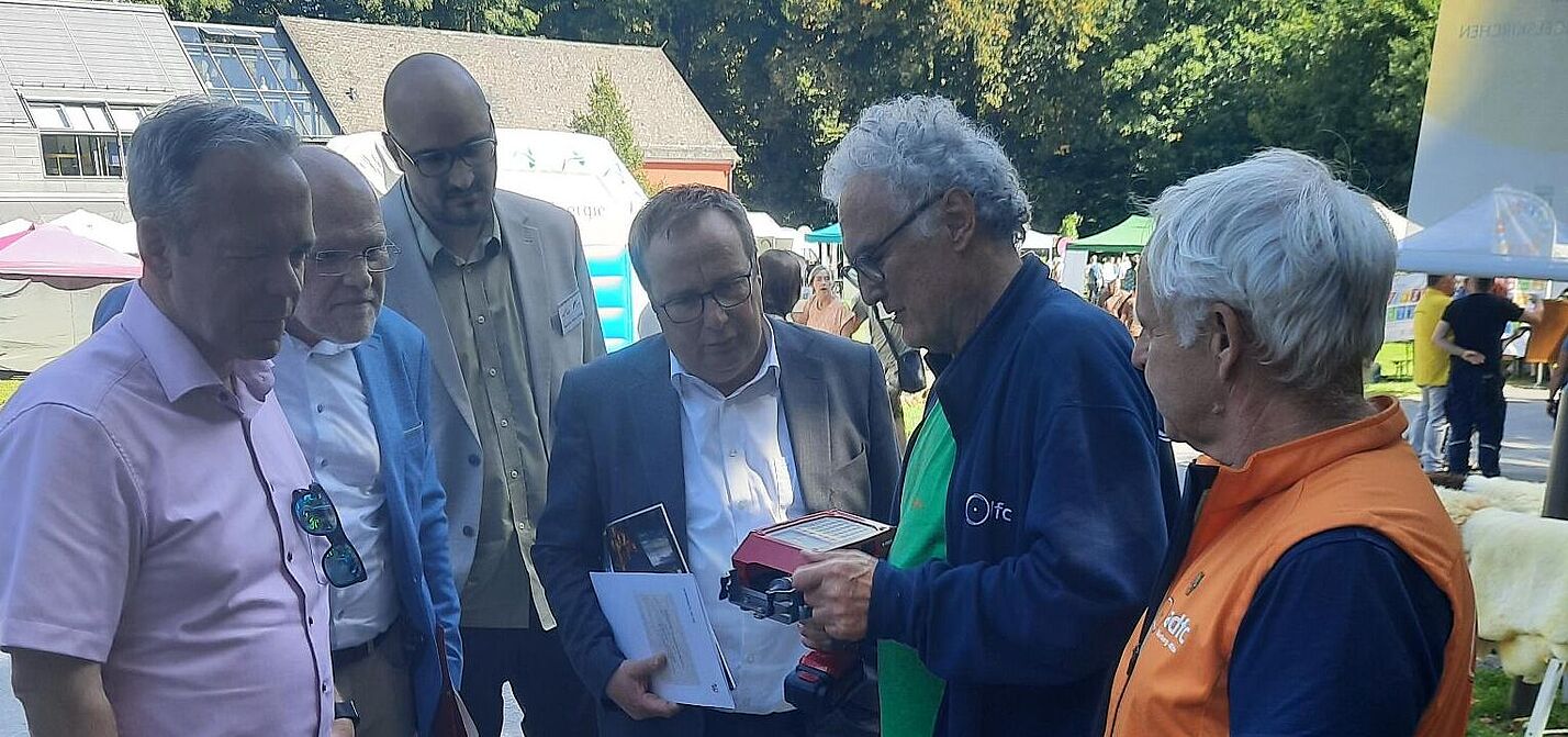 Den Stand besuchten auch NRW Umwelt- und Verkehrsminister Oliver Krischer und Kreisdirektor Klaus Grootens . Beide erhielten eine Demonstration des Codiergeräts und Informationen zum Projekt FAHRRADLAND Oberberg, das Umwelt, Gesundheit und Mobilität miteinander verbindet – belegt auch durch aktuelle Zahlen des Ministeriums zum Nutzen des Radverkehrs.